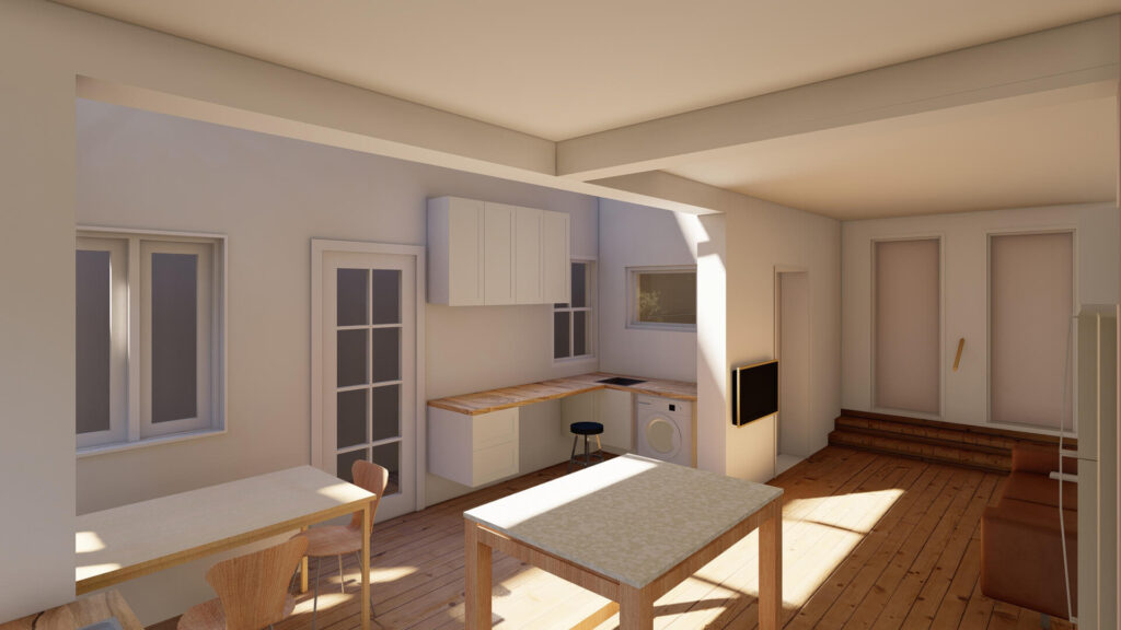 The client for this project was eager to adapt their three-level terrace into a space suitable for aging in place. The ground floor is adapted for mobility, connection to the lush garden and maximising solar gain. The other floors are then left available for shared living.