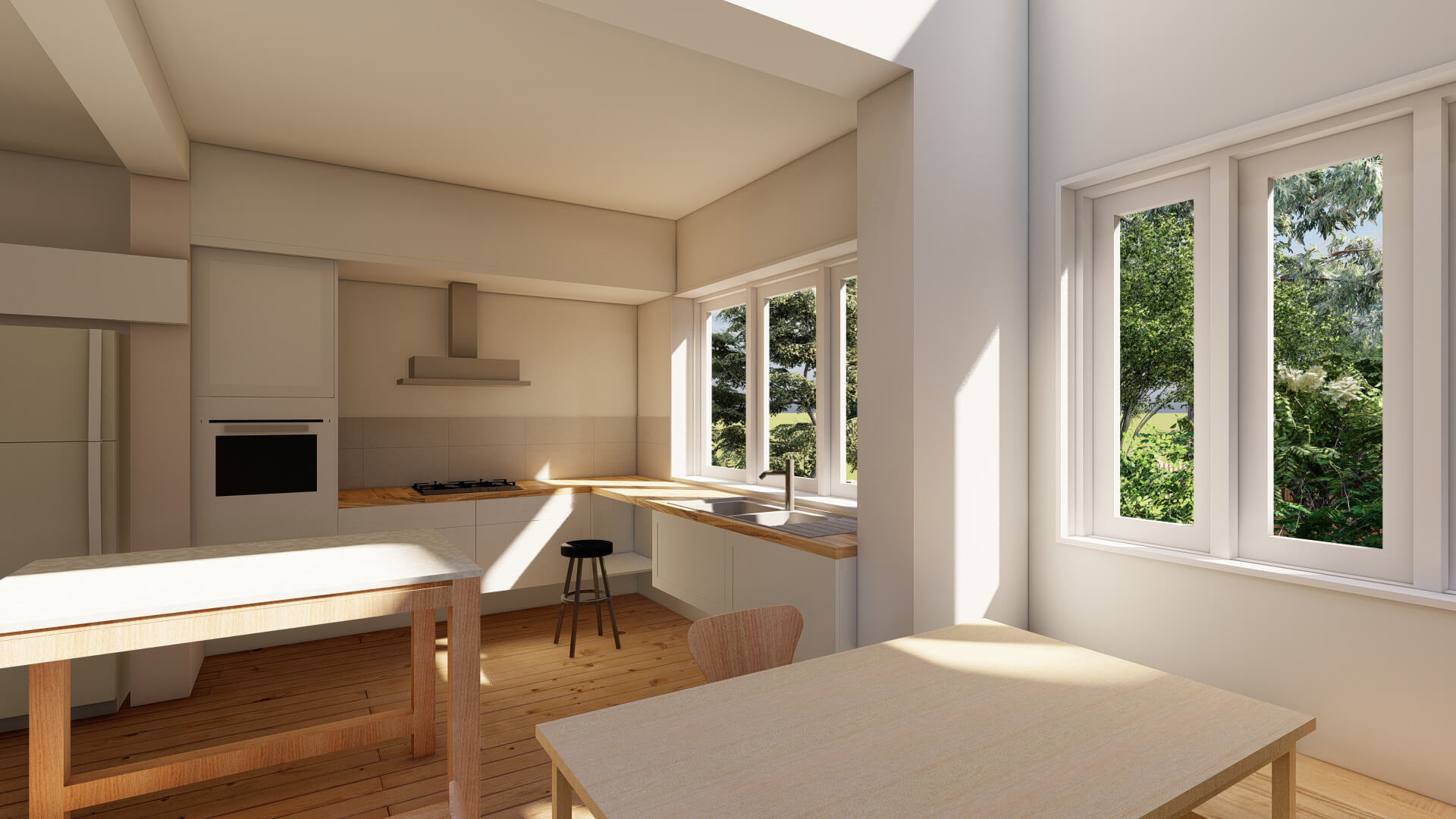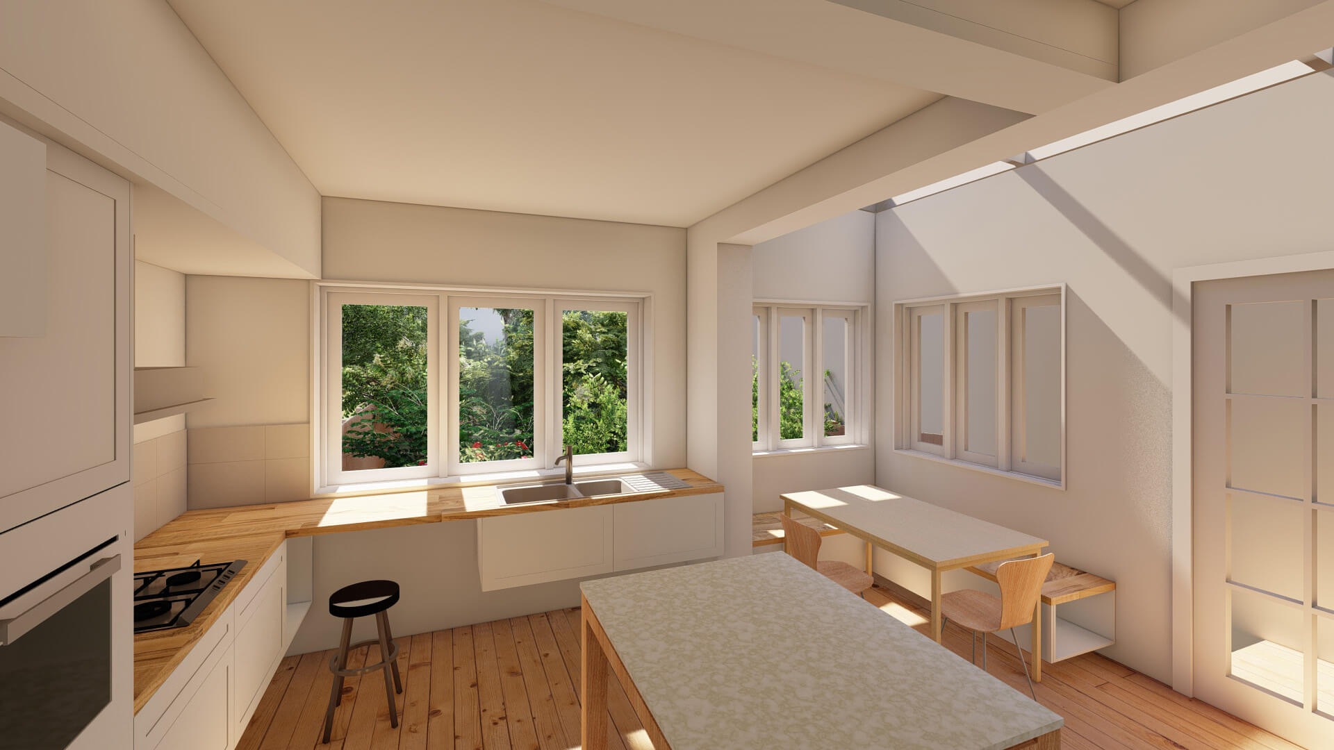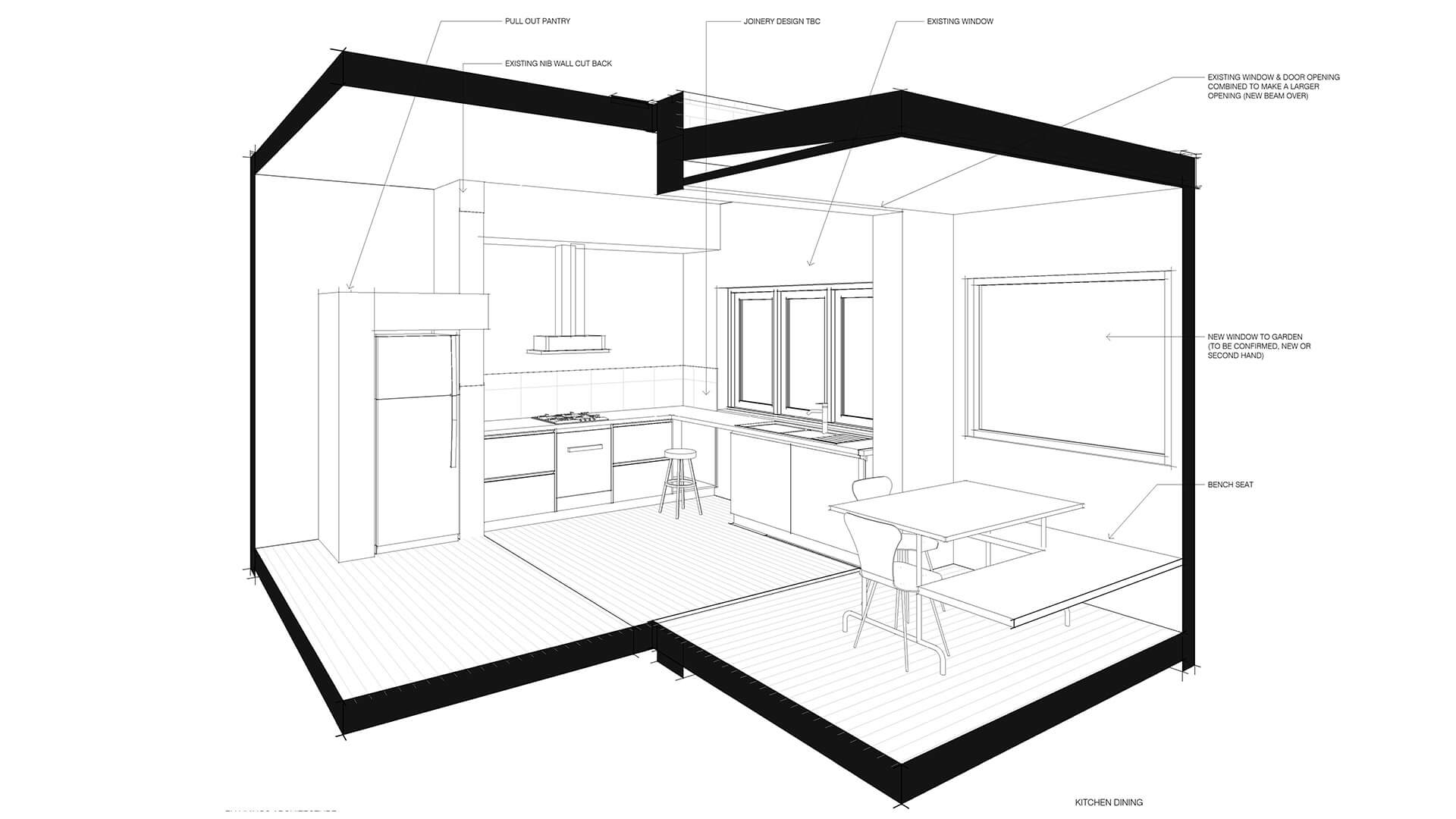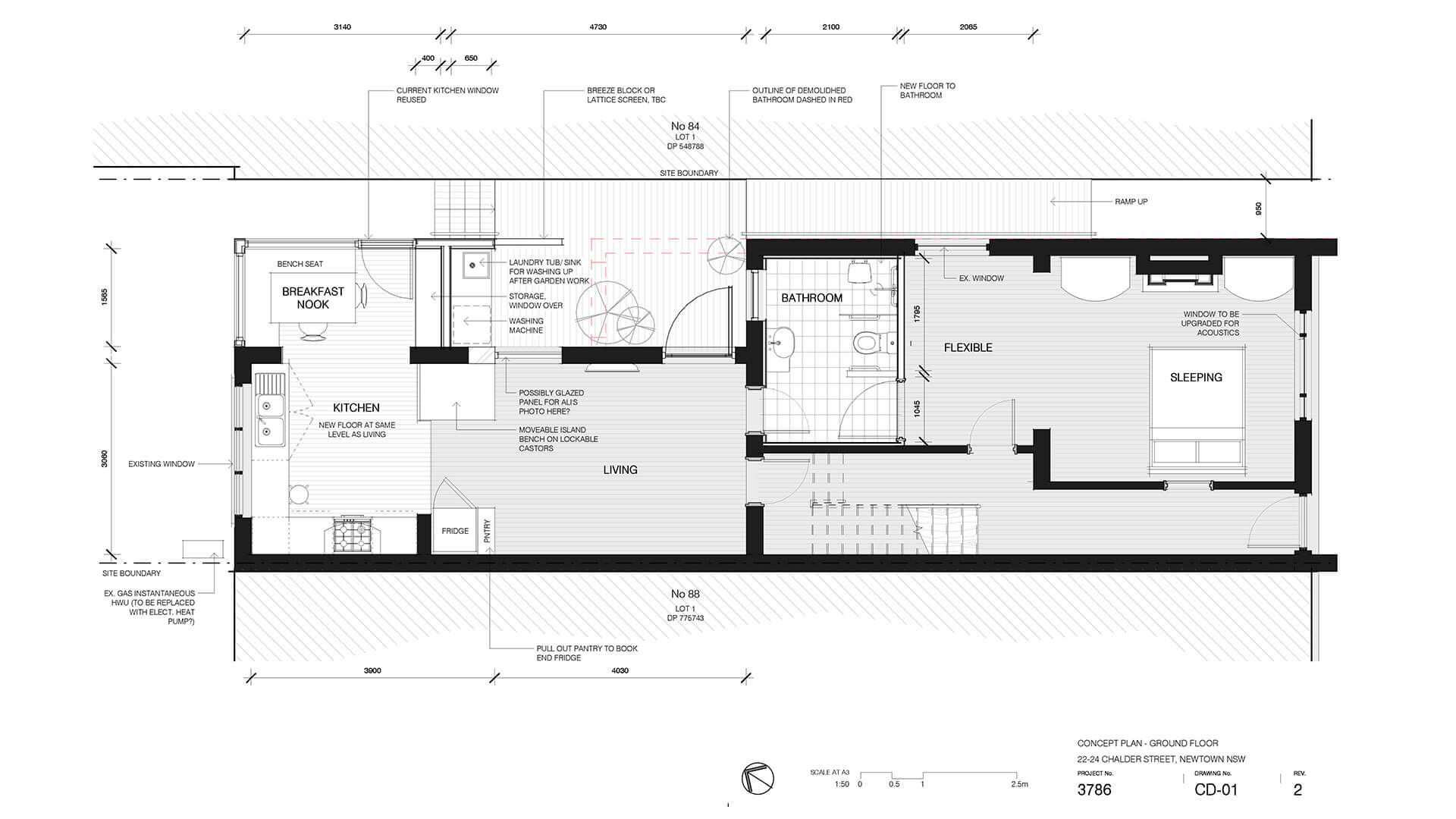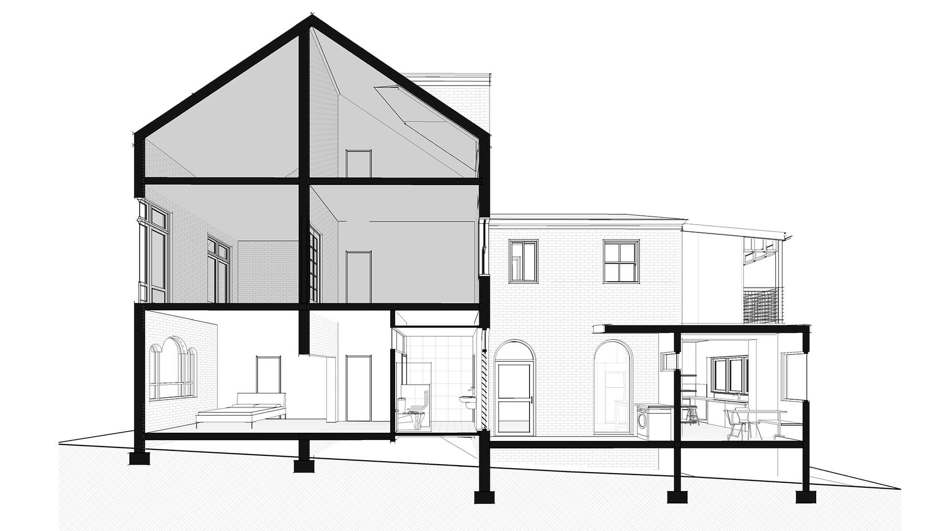 The client for this project was eager to adapt their three-level terrace into a space suitable for aging in place. The ground floor is adapted for mobility, connection to the lush garden and maximising solar gain. The other floors are then left available for shared living.